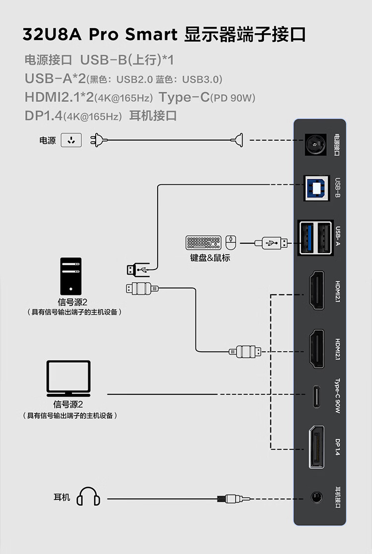两台显示器均有 2 个 HDMI2.1 接口和 1 个 DP1.4 接口,此外 31.5 英寸版本还支持 Type-C 一线连(90W 供电)。
