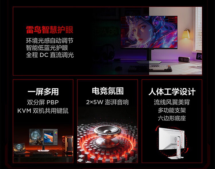 该款显示器支持雷鸟智慧护眼,全程 DC 直流调光;支持 KVM 功能,可双机共用键鼠;采用六边形底座和多功能支架。