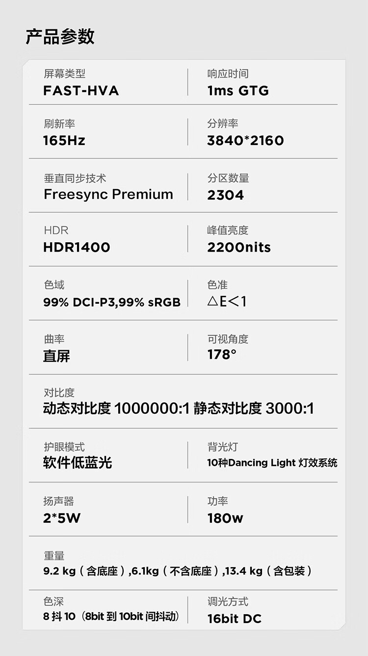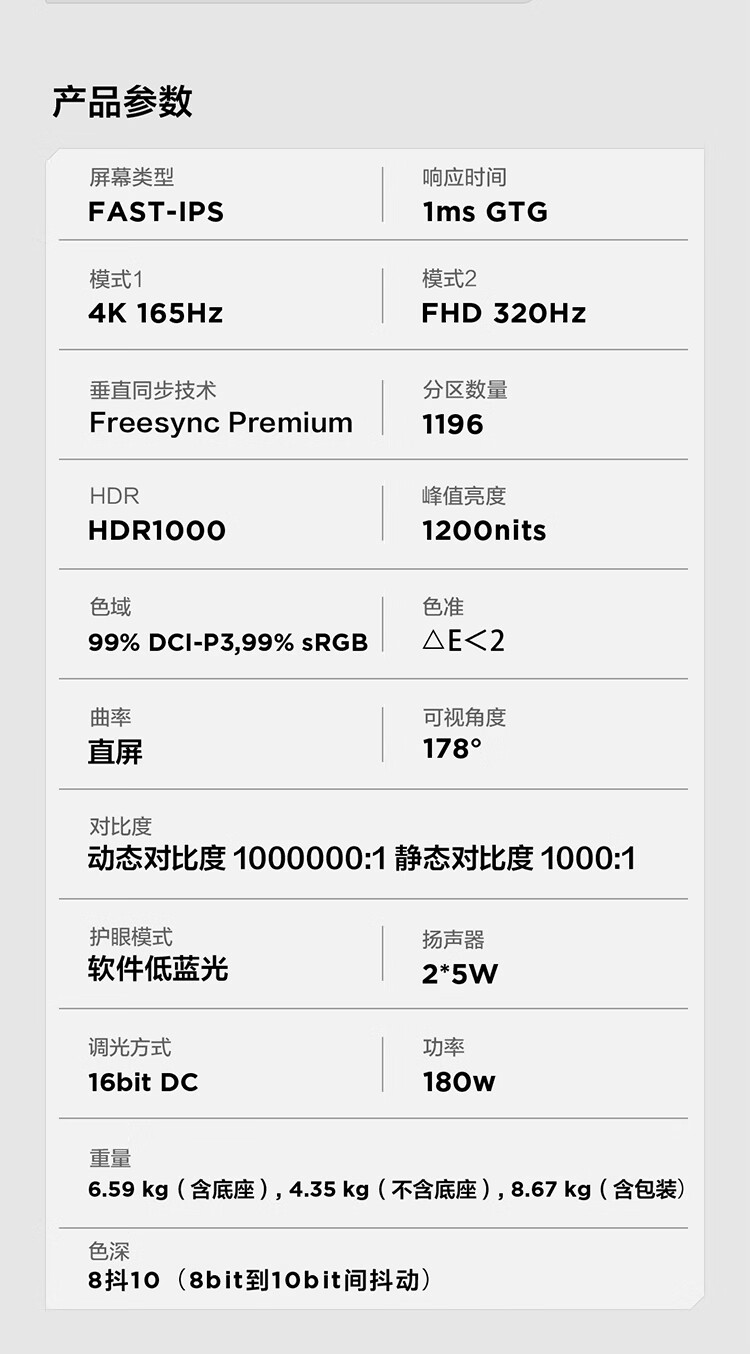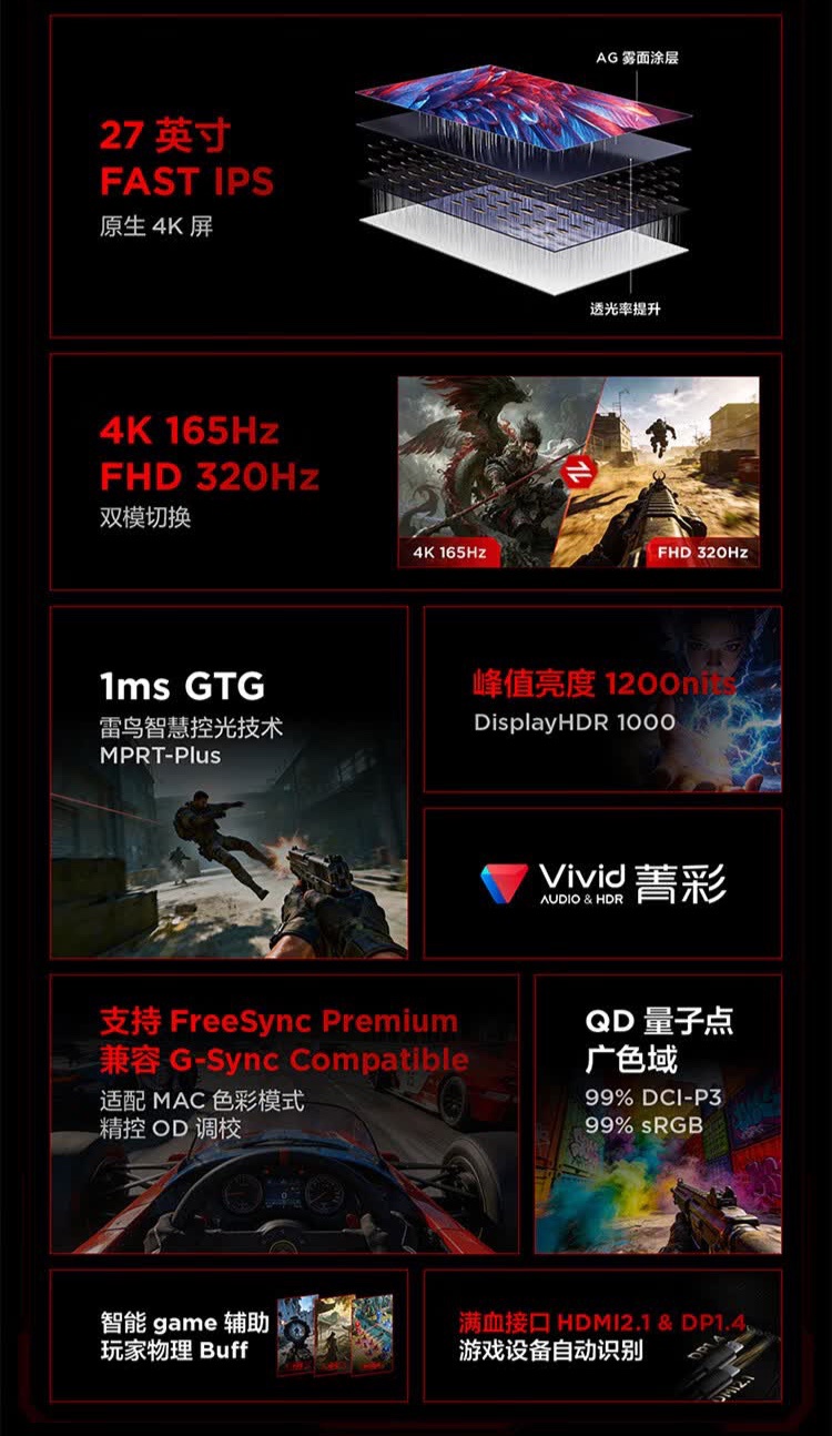该显示器采用 QD-Mini LED 4K 165Hz 显示屏;27 英寸版本为 1196 分区背光,31.5 英寸为 2304 分区背光;27 英寸峰值亮度 1200nits,31.5 英寸峰值亮度 2200nits;此外 27 英寸版本还可切换为 FHD 320Hz。