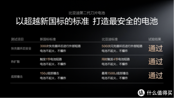 ·成功挑战超新国标难度的"热扩散"试验:今年新国标标准要求触发1节电池短路后电池包不起火、不爆炸,第二代刀片电池进一步提升难度,挑战同时触发4节电池短路,周围电芯依然保持正常温度,电池包无热扩散、不起火、不爆炸,远超新国标要求。